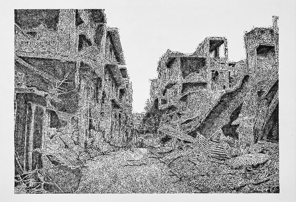 Homs - una ciudad en desintegración, fineliner, 50 x 70 cm