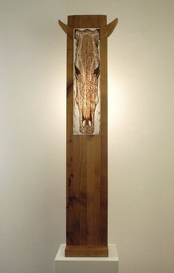 Bull, light object, 120 cm, cherry wood, wood, lino print