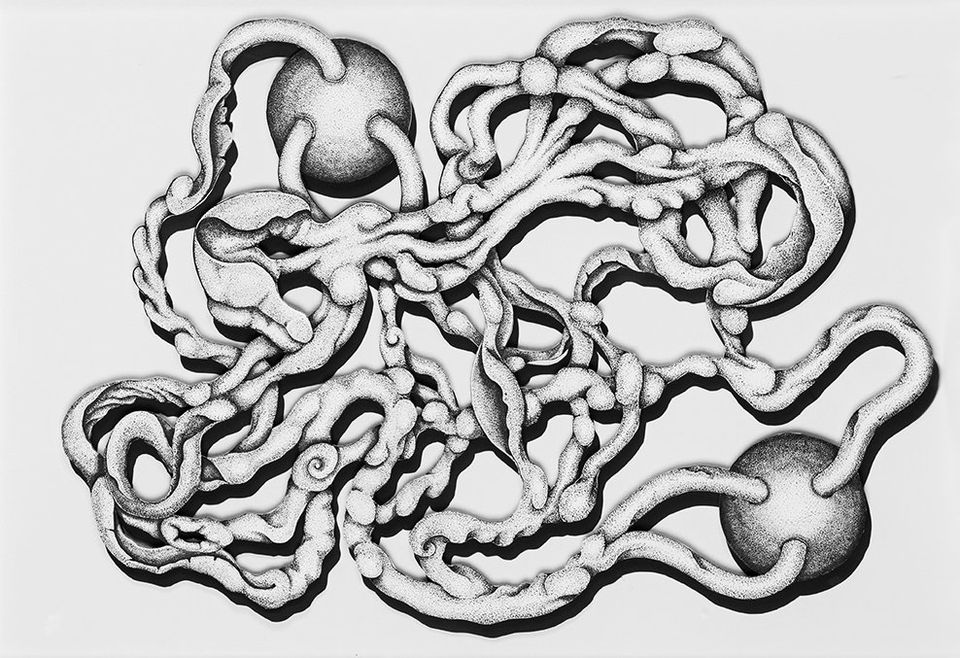 Comunicación, dibujo fineliner y corte a cuchillo, 50 x 70 cm